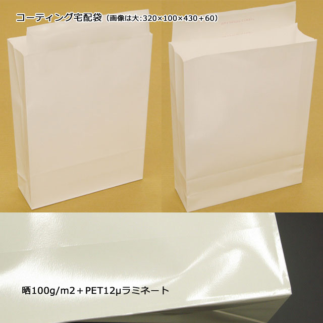 | コーティング白無地宅配袋 大 | 晒100g+PETラミ | 320×100×430+50 | 100枚 |